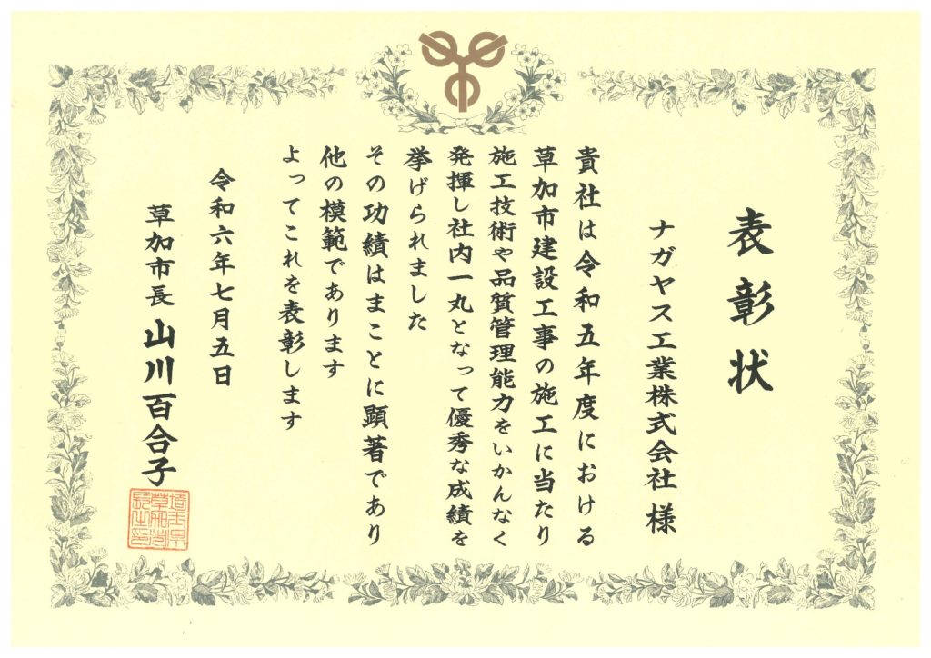令和6年7月5日に開催されました「草加市優秀建設工事表彰式」において、当社が「平均点優秀工事表彰」の部門で表彰されました。